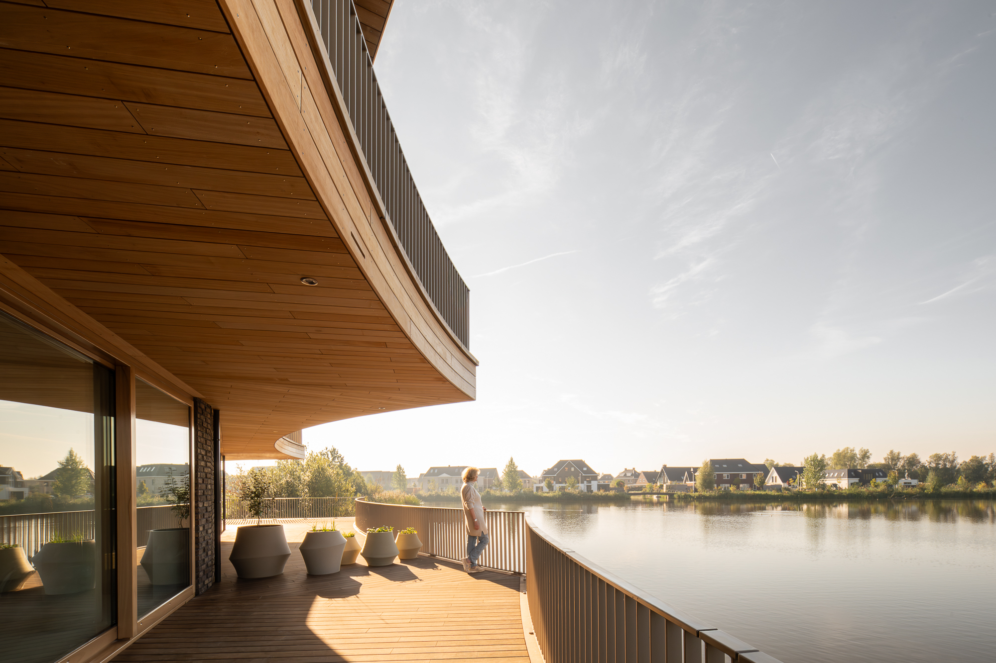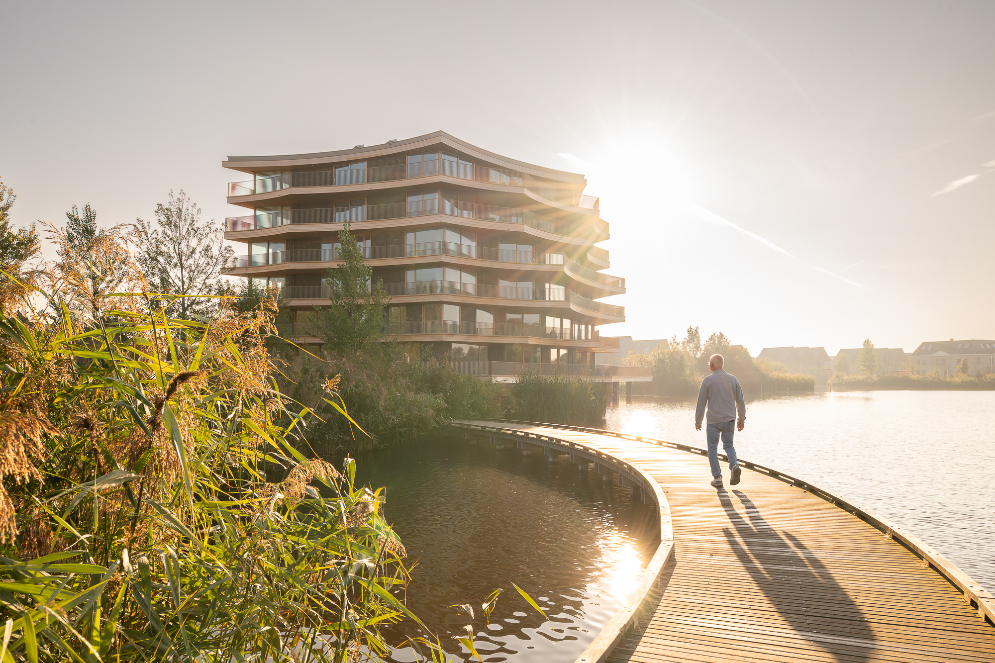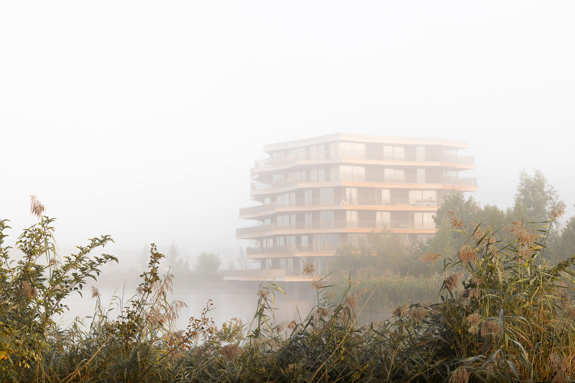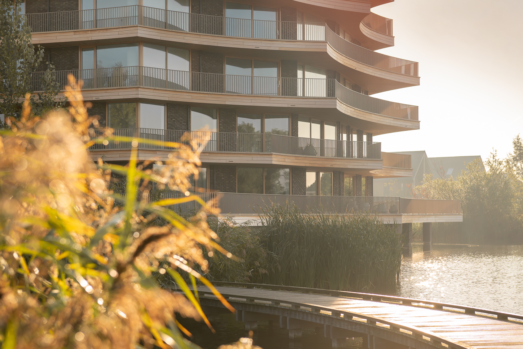 De Juffer is a nature-inclusive residential building in Pijnacker, shaped by its parklike surroundings. The organic, angled facades and timber terraces embrace existing and newly planted trees, bringing residents into direct contact with the landscape.