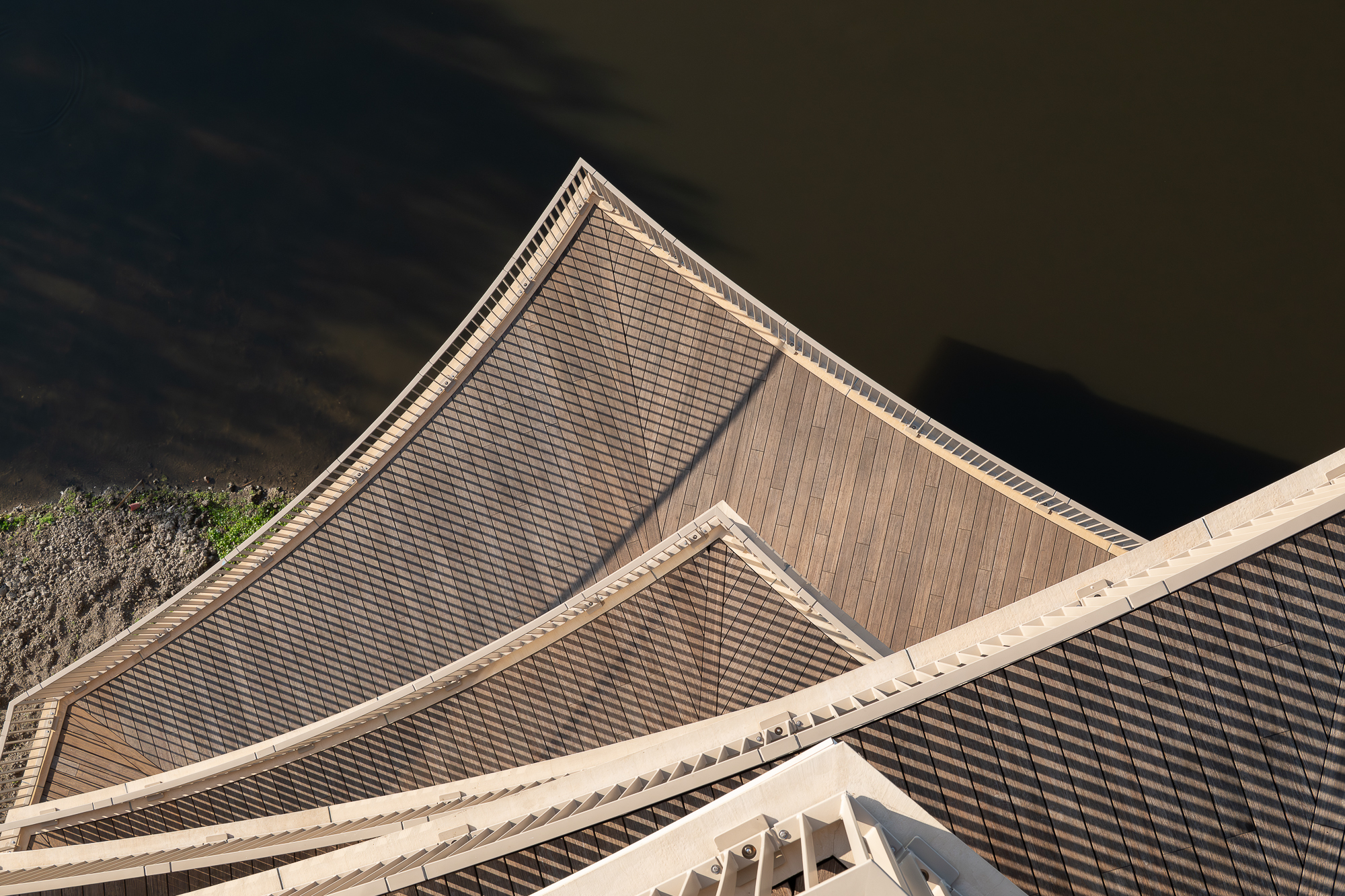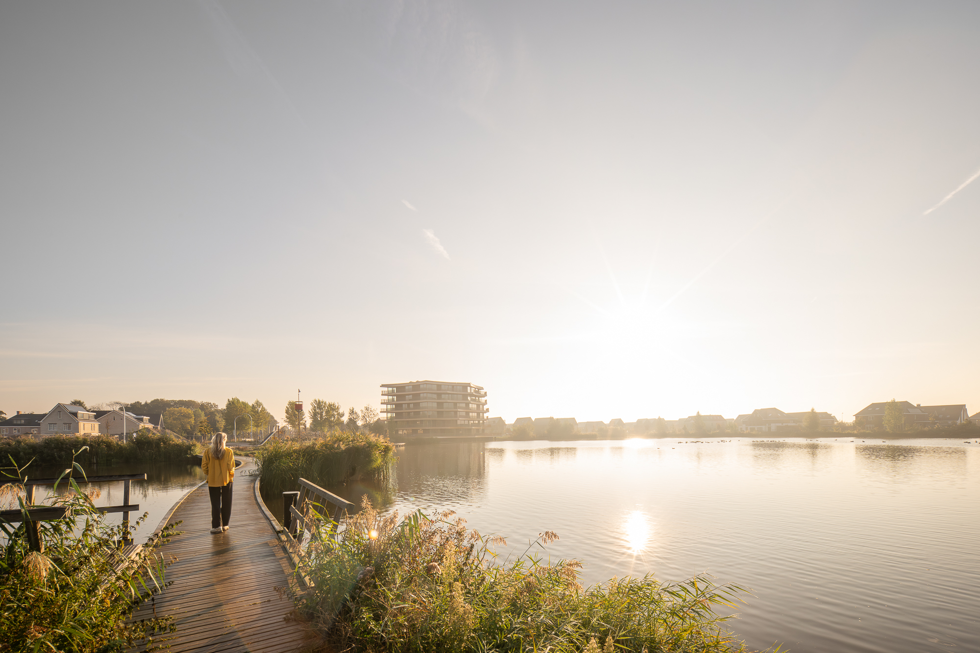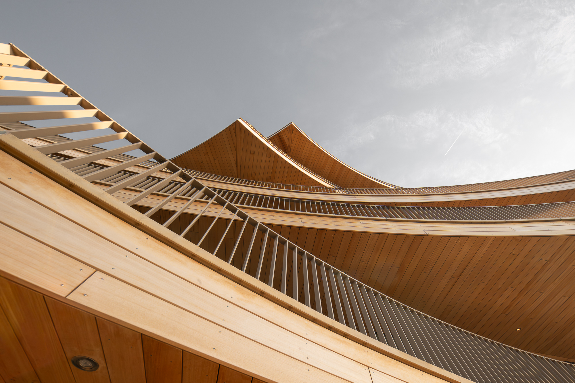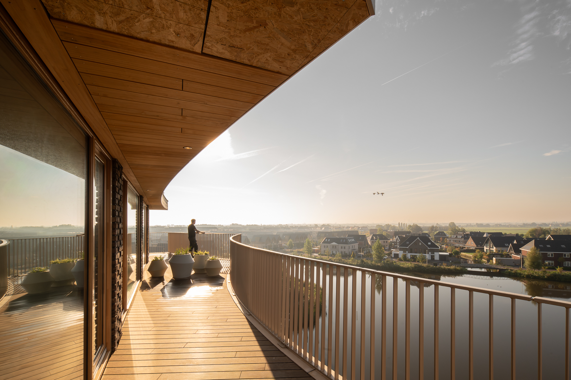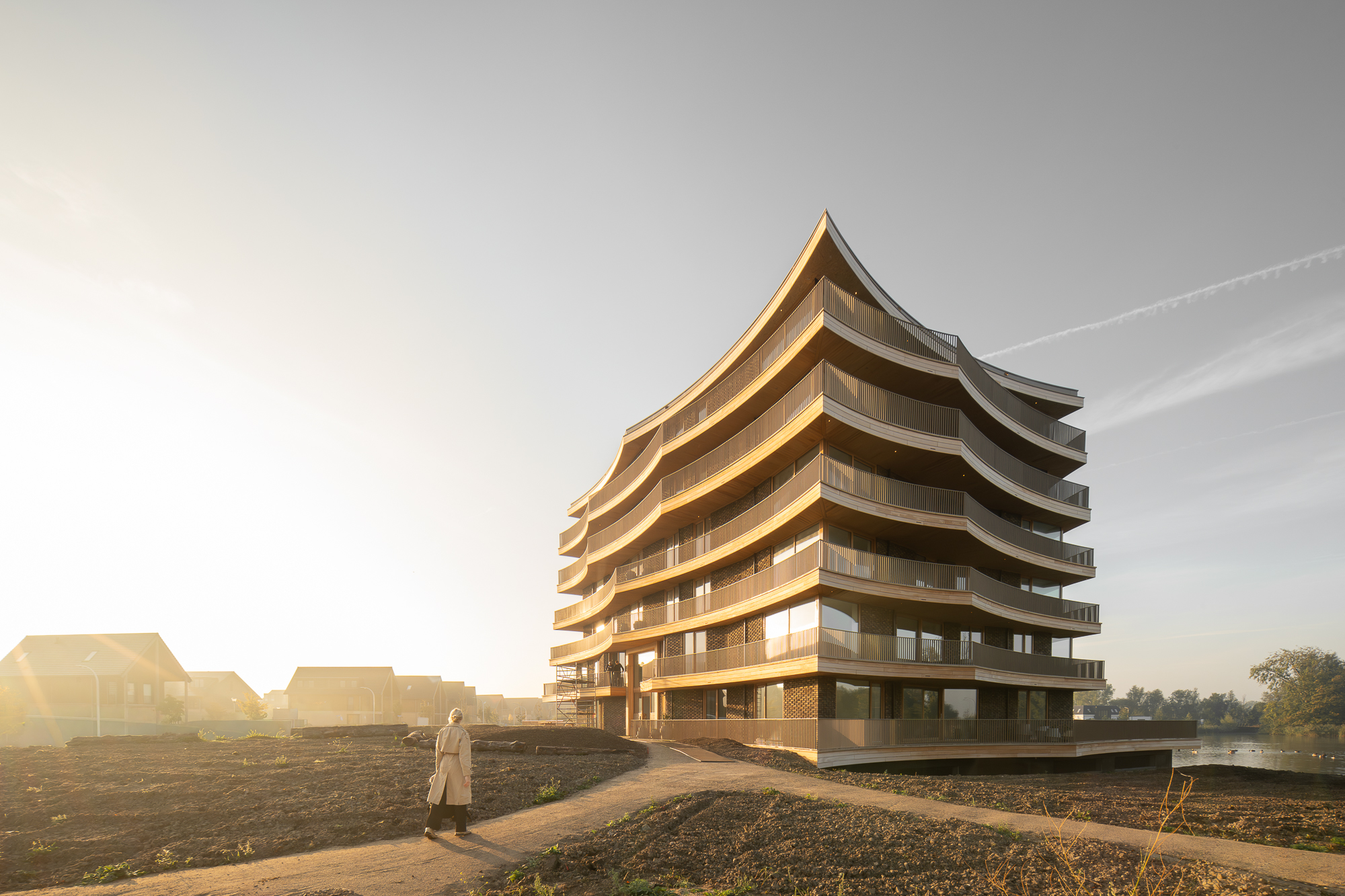 De Juffer is a nature-inclusive residential building in Pijnacker, shaped by its parklike surroundings. The organic, angled facades and timber terraces embrace existing and newly planted trees, bringing residents into direct contact with the landscape.