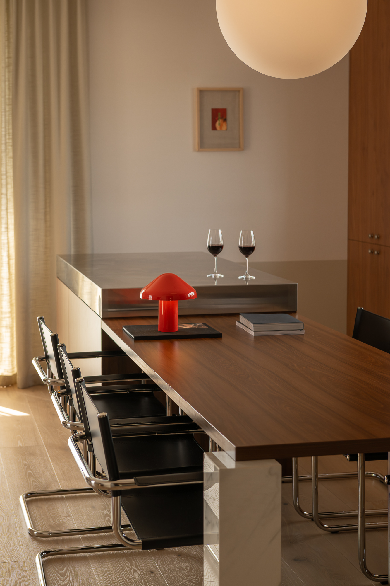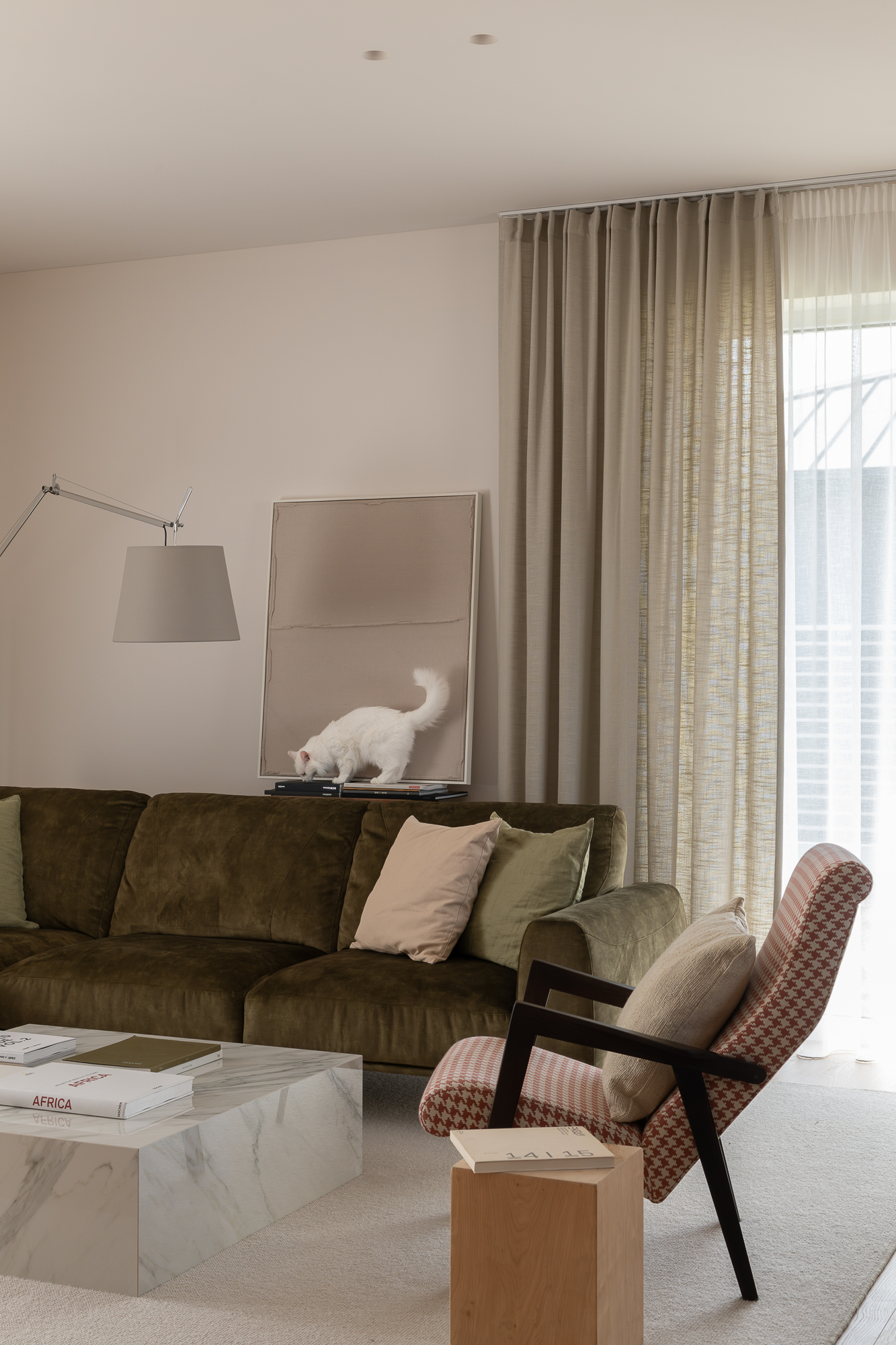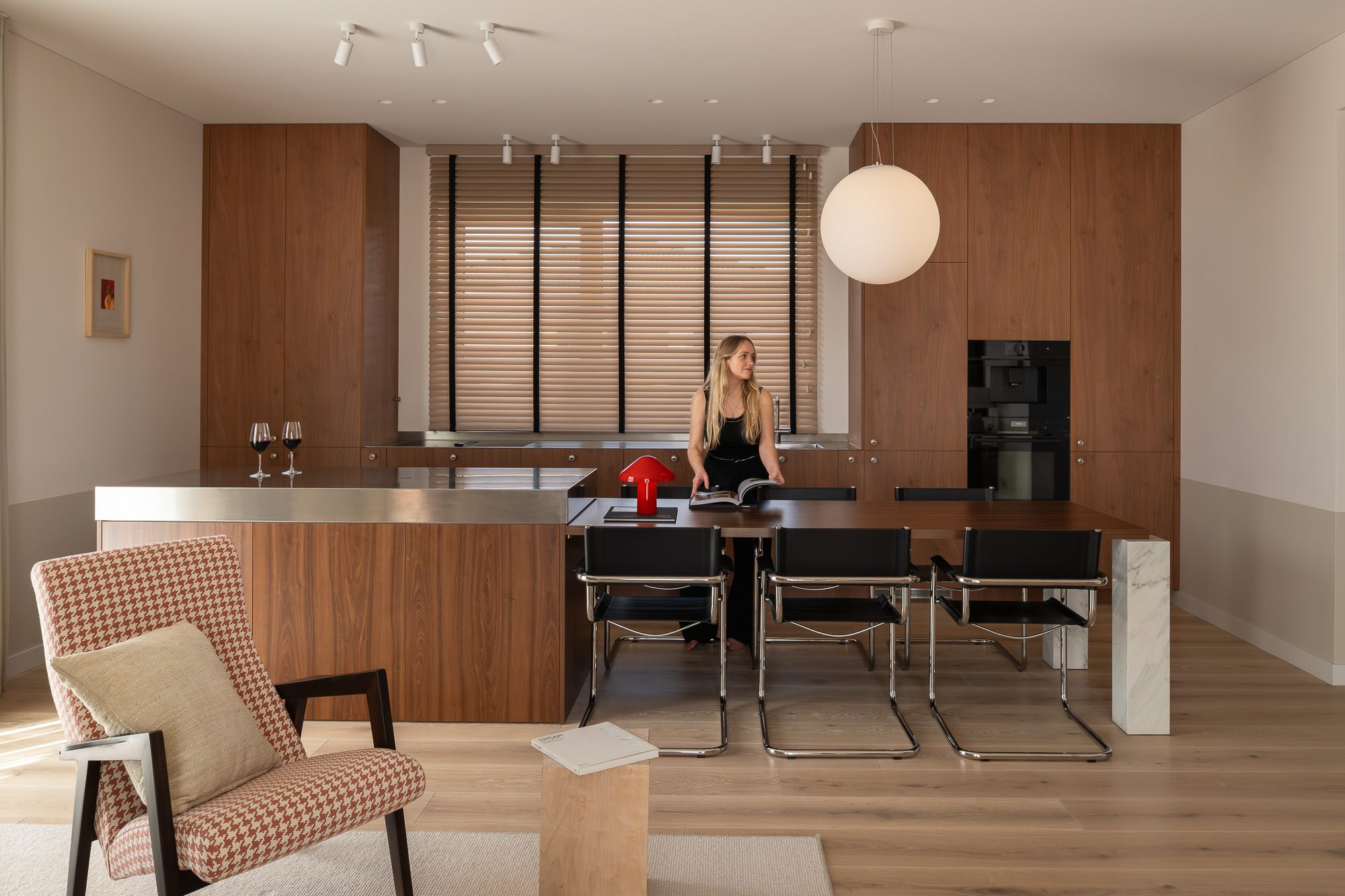 A 140 m² home in Vilnius where clean lines, warm wood tones, and bold geometric forms come together in a refined mid-century-inspired interior. Organic colours and a focus on comfort give the space an effortless, lived-in elegance.